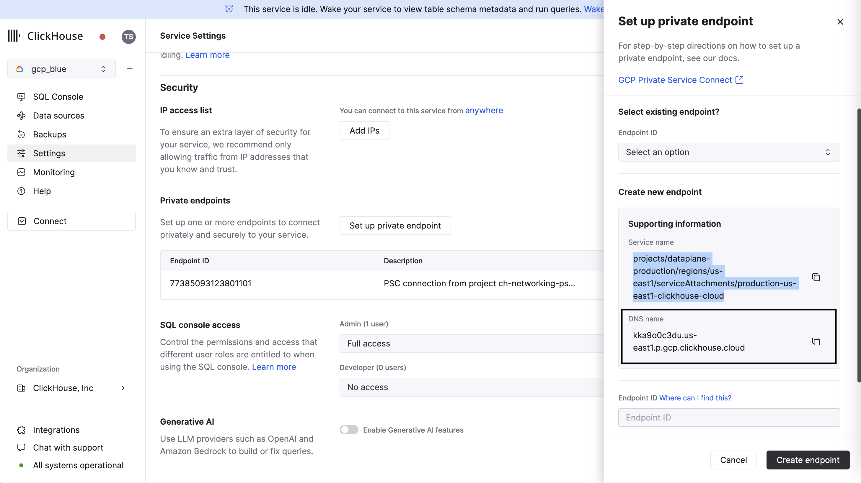 In the ClickHouse Cloud console, open the service that you would like to connect via Private Service Connect, then navigate to Settings. Enter the Endpoint ID obtained from the previous step.